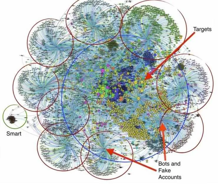 In a nutshell, if you use the hashtag, it signals a bot to message your account—to sow fear and doubt to trigger anger—a classic FUD campaign. That’s coupled with fake accounts which continue the campaign. (The greenish-blue line are bots, which attacked at such a high frequency that it effectively shut down the green Smart campaign.)