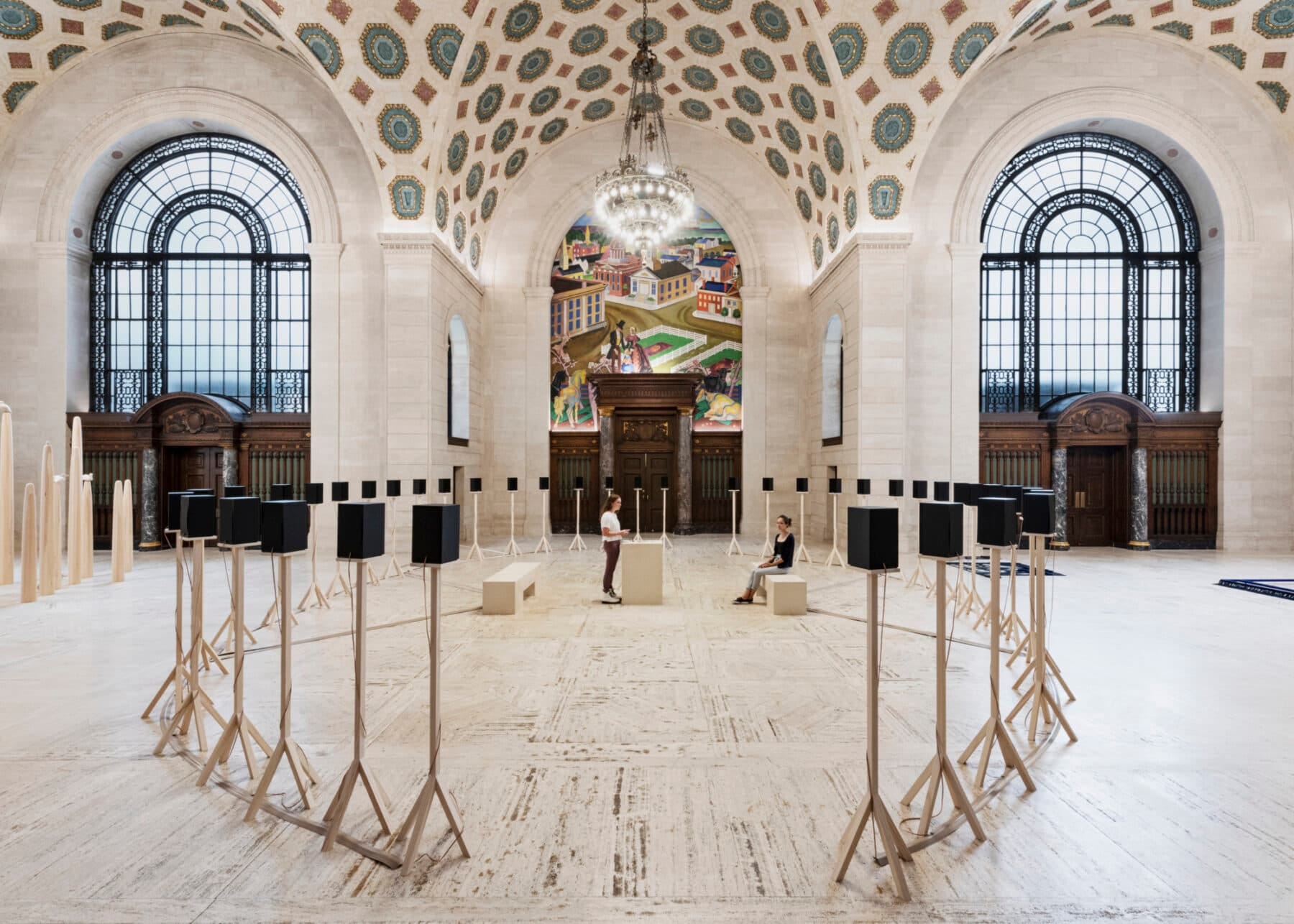 But yeah, I had a solo show at the MassArt Art Museum and the centerpiece work was something that I developed for the FRONT Triennial a year prior. It’s an installation piece called 40 Part Part. It was first installed in a beautiful cavernous library room. And then in the museum it was installed in what we would think of as like a white cube type of space. But traditionally quiet spaces: the library, the museum, the gallery. Just so you get a picture of it, it is forty speakers arranged in a circle facing inward, all of them on nice wooden stands. The circle’s thirty or forty feet wide, so it’s a big thing. And you walk into the gallery and it looks like a piece of minimalist sculpture. In the center of the ring of speakers, there’s two benches and a plinth. And sticking out of the plinth, there’s a Bluetooth button and a Lightning adapter and an aux cable.