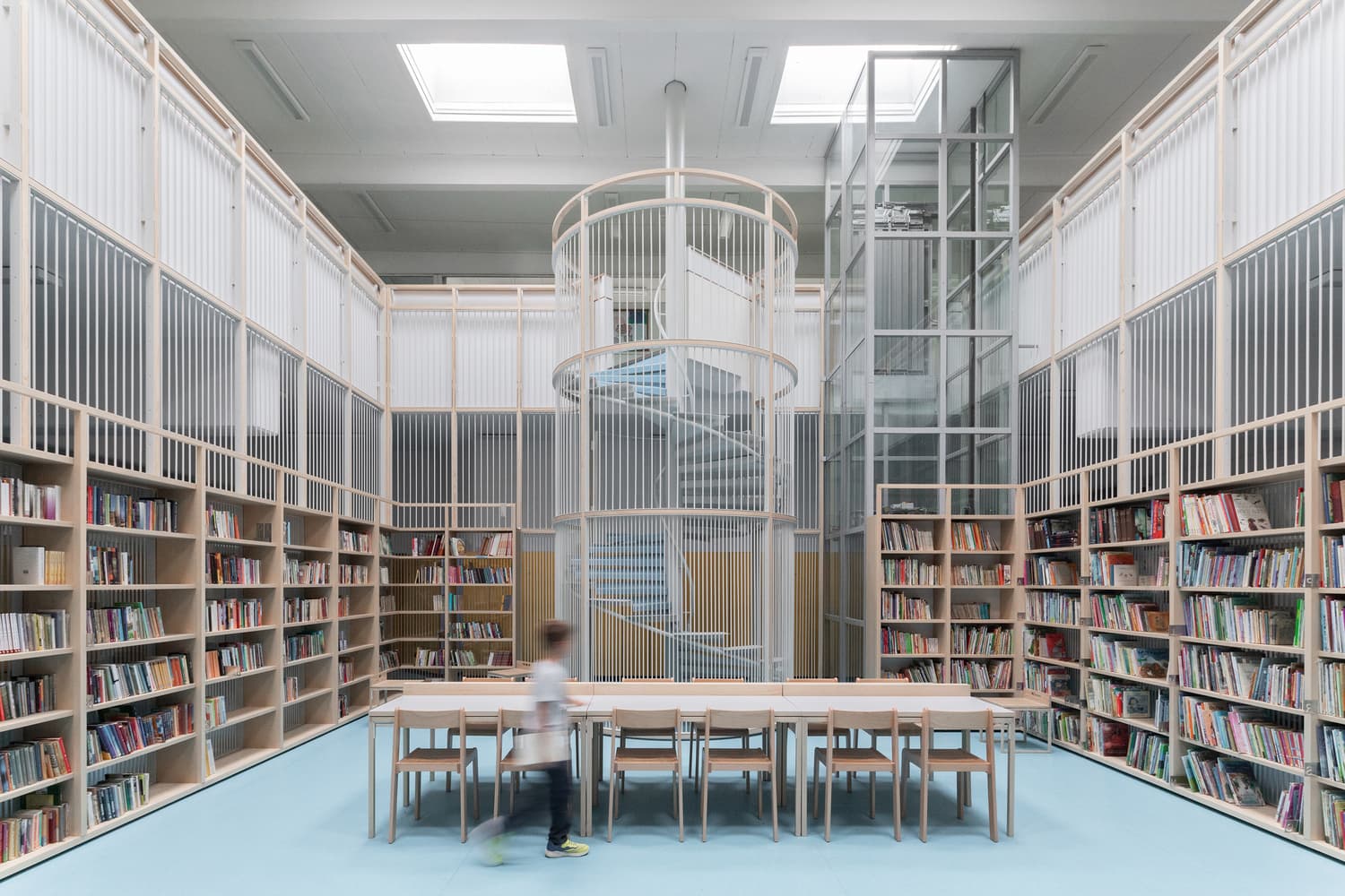 The Vič Primary School in Ljubljana was seeing increased enrollment, so turned to ARP Studio to design a new classroom for a double-height common space at the center of its building. Realizing the space wouldn’t be conducive to learning, the designers instead proposed to move the existing library and give its space to the new use. Inserting a thin metal frame into the common area enabled the architects to hang shelves around the room’s edges and leave the middle open for tables—or, when needed, for other purposes. Revealing a previously closed-off spiral staircase adds a touch of drama to this simple, inviting room.