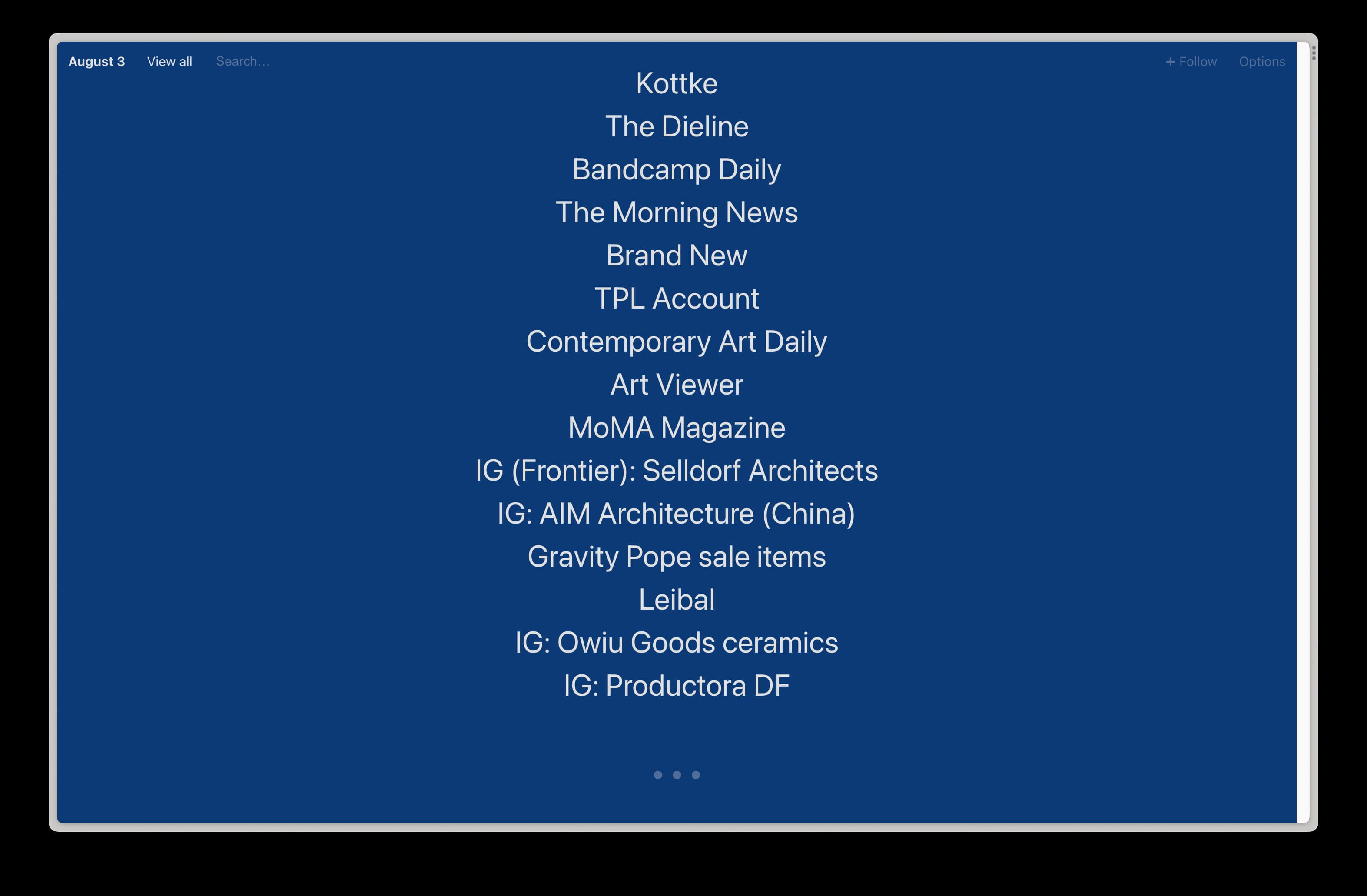 What does that mean in practice? I use it as a kind of variable-speed bookmarking tool, and have added the Instagram accounts of friends, the portfolios of design and architecture studios, the homepages of quarterly journals, the sale pages of stores where I like to shop, and more. I only see them when I want to: a friend’s Instagram account might pop up every two weeks, giving me a chance to peek in on their life, whereas I might visit a studio’s portfolio every six to nine months. Part of the fun is the random juxtaposition of links to click each day. I never know what I’ll be pointed to, but I always know it’s something I’ve chosen to follow.