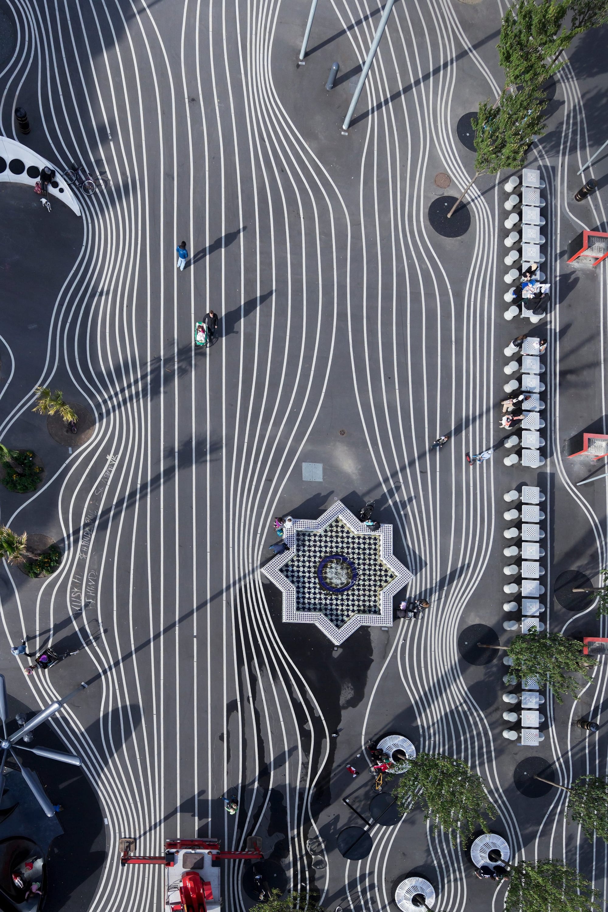 Superkilen Park in Copenhagen contains cultural artifacts from local immigrant communities embedded into the physical space. Designed collaboratively by BIG (Bjarke Ingels Group), Topotek 1c, and Superflex, the park is filled with more than one hundred artifacts sourced from or inspired by the diverse immigrant communities of the surrounding Nørrebro neighborhood, turning the park into a catalogue of global culture.