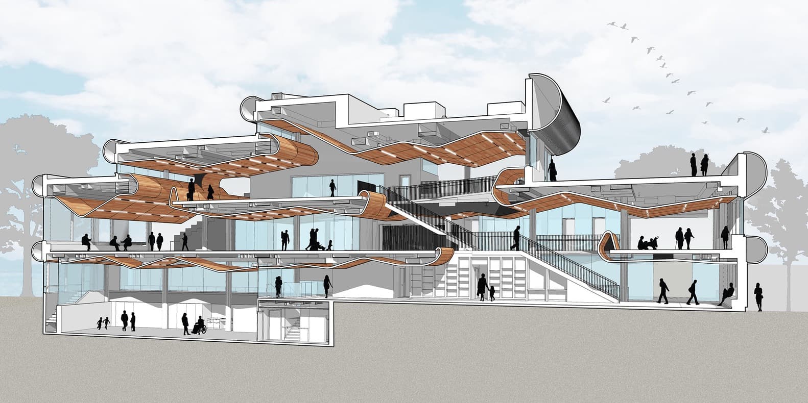Brian Sholis: Both buildings respond to early-1970s precedents, whether through direct renovation or through adjacency. Obviously there are differences between that high-modern/Brutalist moment and today, but I thought we could begin by discussing those differences in terms of civic architecture. What messages did those existing buildings try to convey, and what, if anything, is still considered valid about that era’s design approaches?